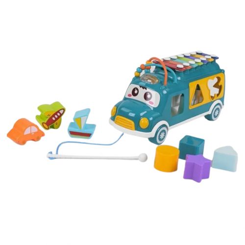Цікава іграшка “Автобус – сортер”. Розмір автобуса – 23х10 см. На даху є ксилофон; з боків – місяця для фігурок (потрібно підібрати фігурку, відповідну до форми. Виконаний з якісного пластику. Для дітей від 3-х років.