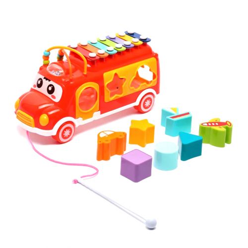 Цікава іграшка “Автобус – сортер”. Розмір автобуса – 23х10 см. На даху є ксилофон; з боків – місяця для фігурок (потрібно підібрати фігурку, відповідну до форми. Виконаний з якісного пластику. Для дітей від 3-х років.