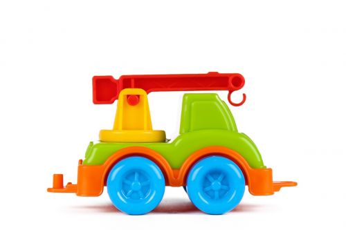 Яскравий, пластиковий, маленький автокран з рухомими елементами.