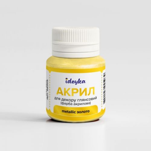 Акрилова фарба ТМ Iдейка 20мл, Metallic Золото (98305). Фарба екологічна, виготовлена з високоякісних органічних і неорганічних пігментів. Кремова консистенція фарби дозволяє використовувати її відразу, без додаткового розведення. Фарба рівномірно лягає і швидко висихає. Може використовуватися для нанесення на полотно, картон, папір, дерево і інші поверхні.