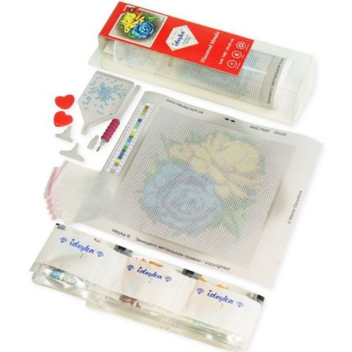 Комплектація: Склад набору: – полотно з клейовим шаром і кольоровою схемою без підрамника, – акрилові стрази згідно комплектації набору (круглі) та голограмні АВ-стрази, – спеціальна ручка-стилус для роботи зі стразами з м’яким тримачем та 3 додаткових насадки для нього: для 3-х і 9-ти камінчиків-стразів, та насадка для вирівнювання стразів на полотні, – два гель-клея, – лоток для сортування стразів, – зіп-пакети для стразів, – інструкція. Кольори готової мозаїки можуть незначно відрізнятися від показ