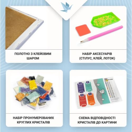 Комплектація: Полотно, ручка-стилус, гель-клей, акрилові стрази згідно з комплектацією набору