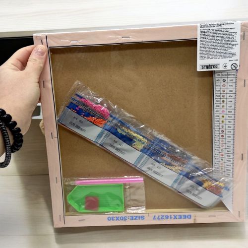Комплектація: бавовняне полотно на дерев’яному підрамнику з клейовим шаром, ущільнене шаром ДВП; кругле каміння-стрази; спеціальний стілус; липка маса для стілусу; лоток для зручного сортування каміння