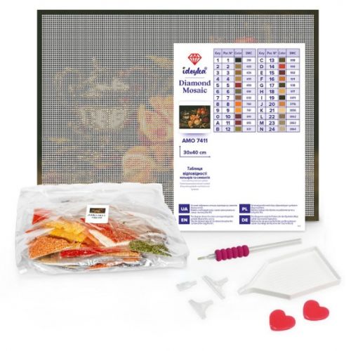 Комплектація: полотно із зображенням, ручка-стилус, гель-клей, акрилові стрази згідно комплектації набору