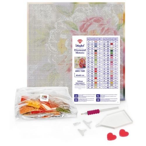 Викладення картин алмазною технікою є чудовим заняттям для зняття стресу, медитації та релаксу. Готові картини можуть прикрашати інтерʼєр. Виблискуючий шедевр створюється за допомогою маленьких різнокольорових кристалів, які один за одним слід приклеювати на заготовлений ескіз. У наборі: полотно з клейовим шаром на підрамнику, лоток для сортування страз, пінцет, стілус, липка маса для стілуса, різнокольорові стрази, схема. Розмір: 40х40 см.