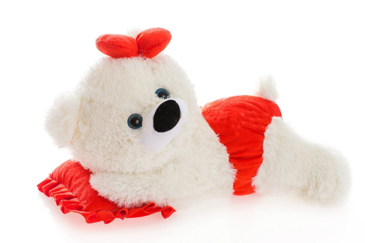 Плюшева красуня Малятко викликає непідробне захоплення та розчулення. Дитина буде дуже радий такому подарунку. Розміри іграшки досить великі – 45 см. Яскравий бант, подушка і штанці радують око. Прекрасне світле ведмежа, що лежить на дуже яскравій червоній подушці, викликає не менш яскраві враження. Він дуже милий, привабливий, симпатичний та позитивний. Виготовлена плюшевий ведмедик Малятко 45 см з м’якого штучного хутра. Матеріал приємний на дотик, тому дитина ні за що не випустить з обіймів цю іграшку. Набивання складається з холлофайбер – сучасного наповнювача гіпоалергенного. Рекомендовано для дітей від трьох років.