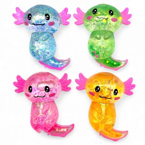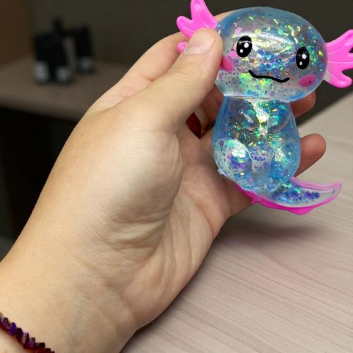 Антистрес у формі аксолотля. У серії присутні різні забарвлення та блискучі блискітки всередині іграшки. Справжня прилипала, але дуже миленька! Знімає стрес та допомагає розслабитися. Має гелеподібний наповнювач. Рекомендовано для дітей старше 4 років.