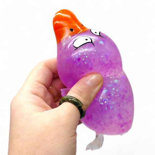 Яскрава жуйка-тягнучка для рук у вигляді качки підніме настрій як малюку, так і дорослому. Виконана із напівпрозорого силікону з блискітками. Іграшку можна стискати, розтягувати, а вона знову прийматиме свою початкову форму. Все завдяки специфічному гелеподібному наповнювачу. Розмір антистресу – 5х5х13 см. Виготовлено з якісних та безпечних матеріалів.