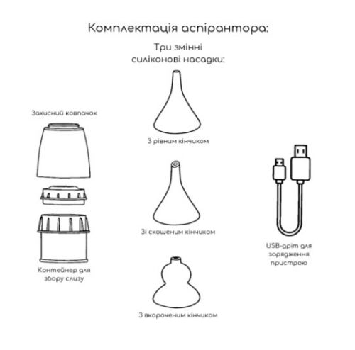 Комплектація: Електронний назальний аспіратор — 1 шт. Силіконові змінні насадки — 3 шт. USB-кабель для заряджання — 1 шт. Інструкція