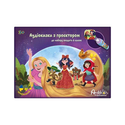 Проектує 16 красивих зображень із 2 дисків для кожної казки. Кожна казка має професійну озвучку доступну через QR-код. Аудіоказки, які входять до набору – «Троє поросят», «Вовк в овечій шкурі», «Міське та сільське мишеня», «Лев та мишеня», «Черепаха та заєць», «Лисеня та виноград». Проектор оснащений функцією фокусування для чіткої проекції. Працює від 2 батарейок ААА (не входять в комплект). Підходить для дітей віком від 3 років.