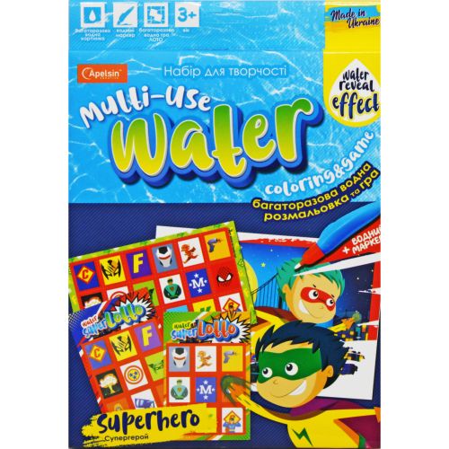 Щоб скористатись водною розмальовкою, треба дістати картинку з упаковки та набрати води в водний маркер для подальшого малювання. Використовуючи маркер, малюнок можна оживити – за допомогою води картинка проявиться. Також у наборі можна знайти водне лото – для гри треба вирізати фішки та вивчити правила. Щоб дізнатися, що зображено на ігровій фішці, треба змочити її водою за допомогою водного маркера.