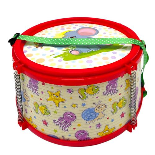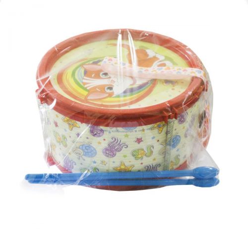 Великий пластиковий барабан, діаметром 20 см. Зверху, знизу і з боків – барабан прикрашений яскравими малюнками. У комплекті також йде регульований шнурочок і 2 барабанних палички.