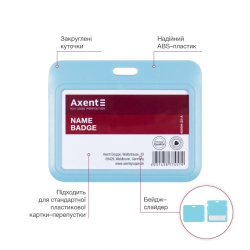 Бейдж-cлайдер горизонтальний. Матеріал: ABS пластик. Зовнішній розмір бейджу: 100*79 мм. Слот для стандартної пластикової картки, пропуск: 85*54 мм. Зкруглені краї. Зручний у використанні. Колір: голубой. Упаковка: запайка. *Відтінок кольору може відрізнятися в залежності від партії товару.