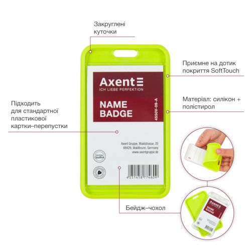 Бейдж-чохол SoftTouch матовий, салатовий, 4550V(54*85мм). Матеріал: силікон + полістирол Зовнішній розмір бейджа: 110*65 мм. Слот для стандартної пластикової карти, пропуску: 54*85 мм. Закруглені краї. Упаковка: запайка.