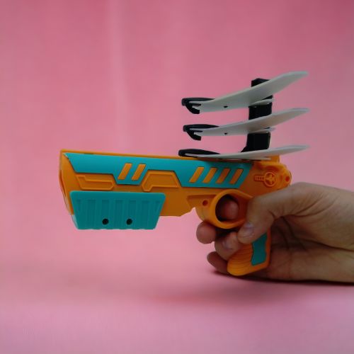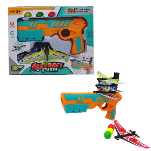 Оригінальний пістолет-катапульта, який, крім звичайних кульок, може стріляти картонними літачками. Літаки заряджаються у верхню обойму і здатні пролетіти відстань до 10 метрів. У комплекті є 3 пластмасові кульки-патрона і 4 літачки. Розмір пістолета: 19 х 12 х 3 см.