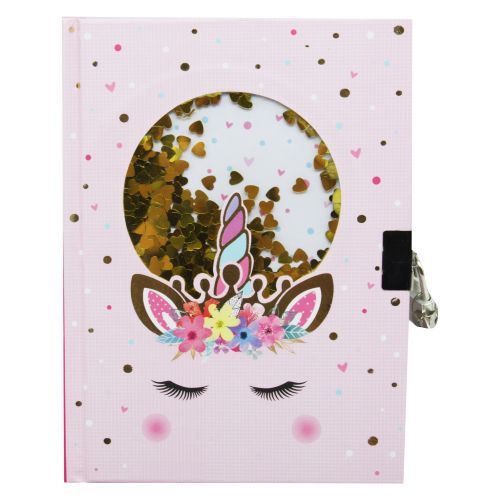 Милий блокнот на замочці, на обкладинці є прозоре віконце, через яке видно кишеньку з блискітками. 80 аркушів у смужку. Розмір блокноту: 13.5х18 см.