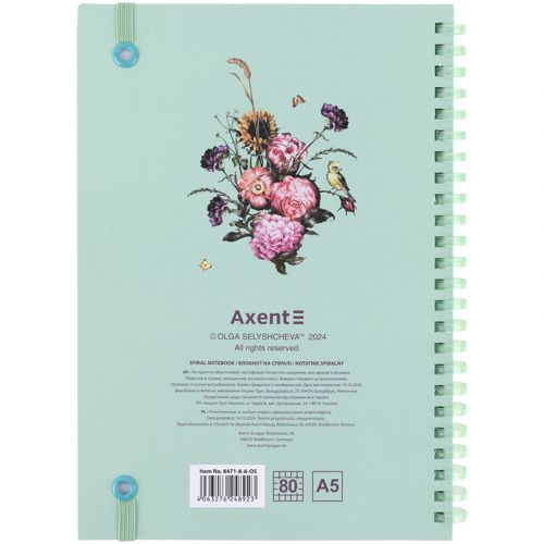Блокнот Axent на м’якій спіралі збоку підходить для щоденних нотаток, фіксації важливої інформації, замальовок схем, графіків, ведення обліку і т.д. Має картонну обкладинку та фіксуючу резинку. Містить білі аркуші паперу щільністю 70г/м2 у клітинку . Формат – середній, А5. Кількість аркушів – 80.