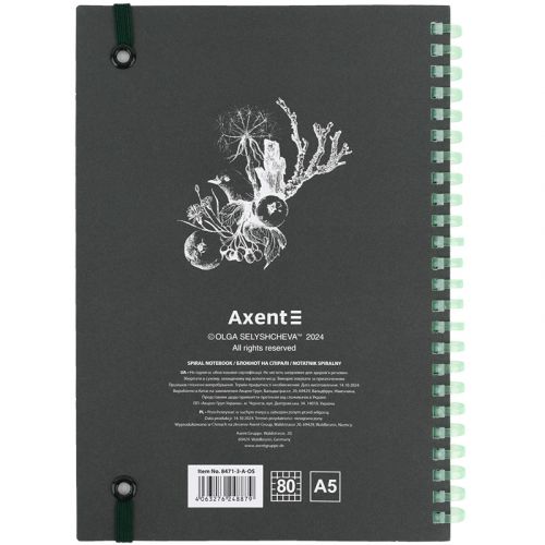 Блокнот Axent на м’якій спіралі збоку підходить для щоденних нотаток, фіксації важливої інформації, замальовок схем, графіків, ведення обліку і т.д. Має картонну обкладинку та фіксуючу резинку. Містить білі аркуші паперу щільністю 70г/м2 у клітинку . Формат – середній, А5. Кількість аркушів – 80.