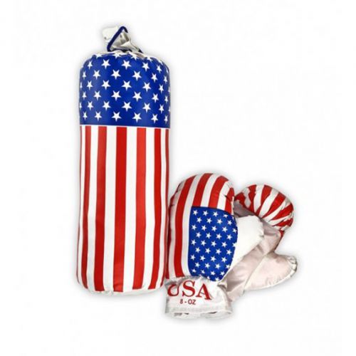 Боксерський набір “Америка” середній. Комплектація: 1 тренувальна груша, 2 боксерські рукавички. Розмір груші – 14 х 14 х 50 см.