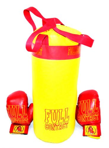 Бокс. Набір “Full”. У набір входить груша (висота 50 см., Діаметр 21 см., Вага 380 г.) жовтого кольору, яку можна фіксувати за допомогою ручок. Також в наборі є пара рукавичок червоного кольору. Набір призначений для дітей від 4-х років.