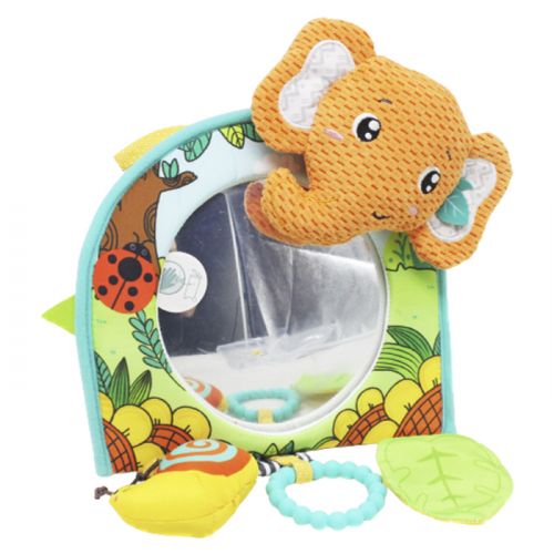 Мʼяка брязкальце з дзеркалом. Текстильна рамка підвіски з кольоровим малюнком. Мʼяка голова тварини обрамляє рамку. Іграшка містить різні елементи, що корисні для розвитку дитини: шелест, мʼяка брязкальце, прорізувач. Безпечне дзеркало. Розмір – 22 х 5 х 34 см.