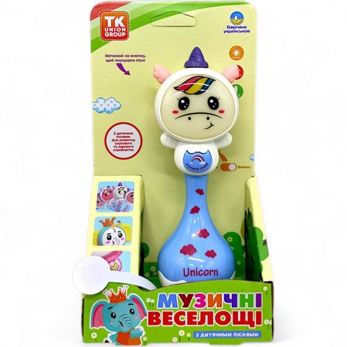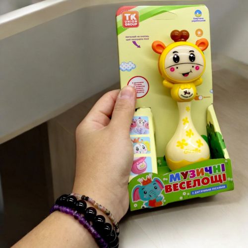 Іграшка виконана у вигляді кумедної тваринки, на животику якої розміщується активна кнопка. Одне легке натискання, і забавка почне підсвічуватись та відтворювати веселі пісеньки українською мовою (5 пісеньок). На голові тваринки є маленька шапочка: покрутіть її по колу і почуєте характерний звук тріскачки. Брязкальце виконане у приємних пастельних відтінках, які стануть справжнім задоволенням для очей. М’яке підсвічування іграшки дає можливість використовувати його й у вечірній час. Розмір брязкальця – 14х4,5х4,5 см. Для дітей старше 12 місяців.