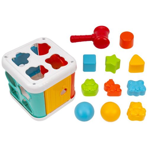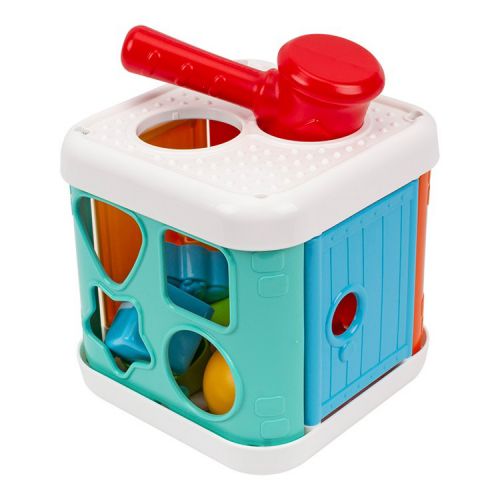 Оригінальна іграшка-сортер у вигляді будиночка, всередині якого знаходяться фігурки, які потрібно вставити у відповідні отвори. Також на одній із сторін будиночка є шестерня, яку можна крутити, а на даху будиночка розташовані два круглі отвори, в які дитина зможе забивати молоточком кульки. Мотолочок є в комплекті. Розмір будиночка: 14х14х12 см.