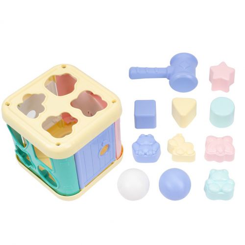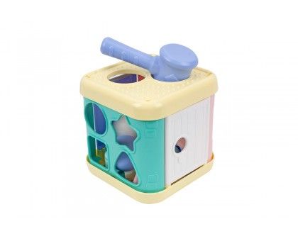 Оригінальна іграшка-сортер у вигляді будиночка, всередині якого знаходяться фігурки, які потрібно вставити у відповідні отвори. Також на одній із сторін будиночка є шестерня, яку можна крутити, а на даху будиночка розташовані два круглі отвори, в які дитина зможе забивати молоточком кульки. Мотолочок є в комплекті. Розмір будиночка: 14х14х12 см.