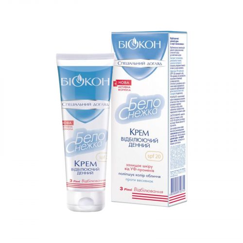 Відбілювальна та захисна дія денного крему Білосніжка визначає сучасний підхід до освітлення шкіри.Екстракт мучниці, дипальмітат койєвої кислоти та вітамін С блокують утворення темного пігменту шкіри — меланіну. Ефективні УФ-фільтри (SPF-20) захищають від УФ-променів, що викликають посилення пігментації та появу веснянок. Оптичне й додаткове освітлення шкіри відбувається завдяки відбілювальній дії екстрактів білої лілії та солодки (гліциризин). Результат: крем запобігає розвитку пігментних плям і веснянок, рівномірно відбілює та покращує колір шкіри, забезпечує профілактику передчасного старіння. Спосіб застосування: нанести на очищену шкіру за 20–30 хвилин до виходу на сонце. Можна використовувати під макіяж.