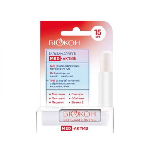 БІОКОН Бальзам для губ «MED-актив».Завдяки унікальній формулі з високим вмістом активних компонентів, що мають відновлювальні та живильні властивості, цей бальзам зволожує, пом’якшує та заспокоює шкіру губ. Забезпечує тривалий захист і швидке відновлення губ після негативного впливу зовнішніх агресивних факторів. Розроблений для швидкого загоєння тріщин та пошкоджень на губах. Повертає губам стан комфорту та красивий вигляд.Не містить ароматизаторів. Захищає від УФ-променів (SPF 15). Спосіб застосування — нанесіть на чисті сухі губи. Повторюйте за потреби для підтримання зволоження та комфорту слизової губ.