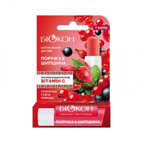 БІОКОН Гігієнічна губна помада «Порічка Шипшина».Користь догляду та сяяння кольору. Поєднує в собі властивості бальзаму, що доглядає за губами, та ніжний відтінок червоних ягід, що надає губам природний і сяючий вигляд.Вітамін С, кверцетин і олія шипшини завдяки антиоксидантним властивостям сприяють збереженню молодості та краси губ, зменшуючи наслідки оксидативного стресу. Мікросфери гіалуронової кислоти зволожують і надають губам більше природного обʼєму та ніжності. Натуральні воски та олії живлять, помʼякшують і захищають губи.