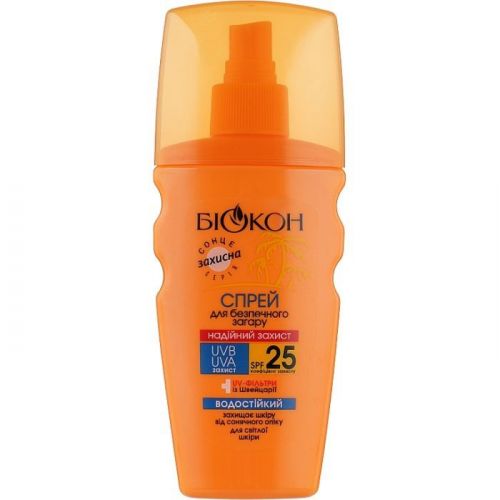 Компанія “Біокон” представляє спрей для безпечної засмаги SPF 25. Його слід наносити на шкіру за 15-20 хвилин до виходу на вулицю й повторно у міру необхідності, у тому числі після купання. Засіб легко наноситься, завдяки легкій консистенції так само легко розподіляється по поверхні шкіри. Забезпечує надійну профілактику сонячних опіків і подразнення. Спрей для безпечної засмаги SPF 25 рекомендований у перші дні перебування на сонці й за високої сонячної активності.