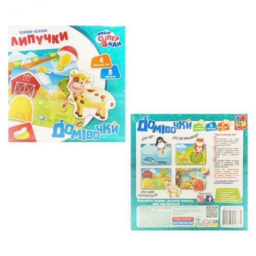 Вжик-вжик липучки “будиночки” (рус). У наборі є чотири ігрових поля, на кожному з яких зображений один пейзаж. Завдання дитини: догадатися, чия саме це місце існування. 4 поля для гри, 8 фігурок.