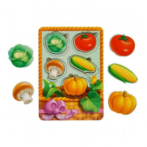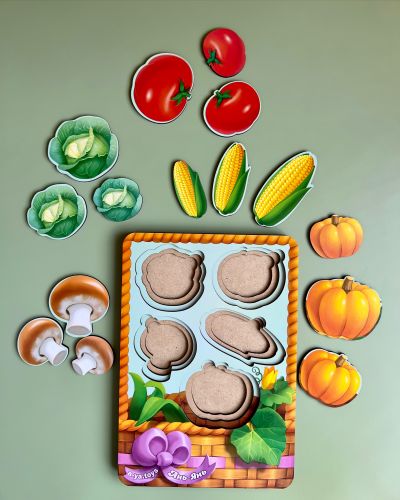Дерев’яні вкладиші будуть відмінним подарунком для дитини. Кожну картинку-вкладиш потрібно встановити в призначену для неї ямочку. В одній ямочці розміщується по 3 вкладиша від маленького до великого. Розмір рамки – 16х23 см.