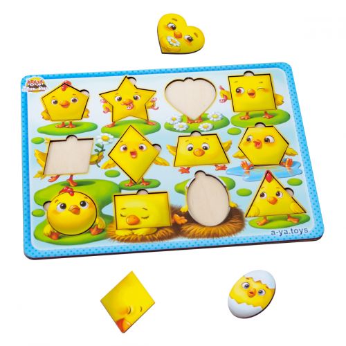 Яскрава та цікава гра. Маленькі курчатка – це 12 вкладишів різної форми, які малюку необхідно вставити на свої місця. Усі деталі легко діставати пальчиками. Під час гри дитина вивчить назви геометричних фігур, порахувати від 1 до 12.