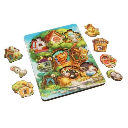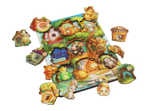 Дерев’яний двошаровий вкладиш стане відмінним подарунком для дитини. У наборі 18 дерев’яних вкладишів – 9 фігурок тварин та 9 будиночків для них. Головна мета для малюка – по картинці підібрати кожній тварині його будинок. За допомогою такої гри дитину можна знайомити із тваринами різних видів, розвивати дрібну моторику рук, логіку. Розмір – 32х23 см.