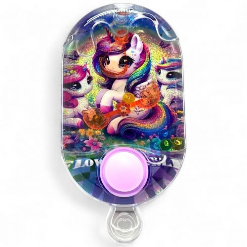Водна гра в кільця (або з кульками) з яскравим малюнком на задній панелі. Стильний, привабливий дизайн. Усередині іграшки знаходиться вода, в якій плавають кільця/кульки. Суть гри: за допомогою кнопки необхідно закинути усі кільця на стовпчики/закинути кульки в жолобки. Виконані із міцного пластику, кнопка гумова.