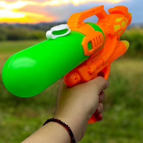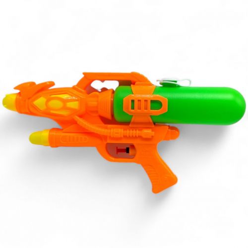Водяна зброя, щоб намочити кожного хто стане на твоєму шляху! – але краще не попадати в обличчя. Оформлене в зелених та помаранчевих кольорах. Має затичку, щоб зручно набирати воду. Розмір – 41 см. Виготовлений з комбінованих матеріалів. Рекомендовано для діток старше 3-х років.