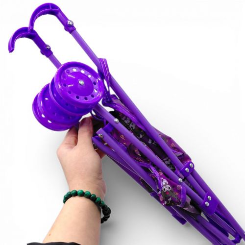 Візок для ляльок виконаний у яскравому фіолетовому кольорі з декоративним текстильним сидінням із принтом аніме-персонажів. Конструкція передбачає металевий каркас та тканинну посадкову частину. Модель легко складається, що дозволяє зручно транспортувати або зберігати її без зайвого місця.