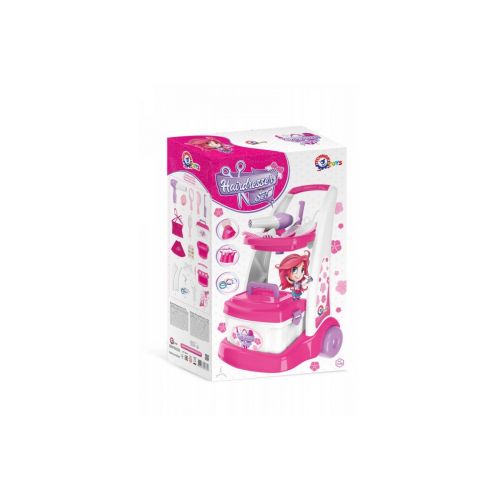 Набір оснащений валізою та зручним візком для переміщення своїх інструментів, забезпечуючи вам все необхідне для створення зачісок для подружок, мами або навіть вашої улюбленої ляльки. У наборі ви знайдете різноманітні професійні інструменти та аксесуари. Для зручності майстра-перукаря передбачений пояс із кишенями, щоб усі інструменти були доступні. А спеціальна накидка на клямці допоможе зберегти одяг клієнта чистим. Крім того, в комплекті включені гребінець, щітка, плойка та шпилька у формі бантика для створення модних зачісок. Дзеркальце з ручкою, пінцет та пудрениця завжди під рукою для ідеального макіяжу. А щоб ефективно висушити волосся та створити легке укладання, пропонується використовувати фен (імітація). Розмір візка – 54 х 39 х 37 см.