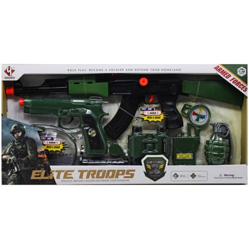 Комплектація: Автомат, пістолет, ніж, свисток, бінокль, навушники з мікрофоном, рація, компас, граната