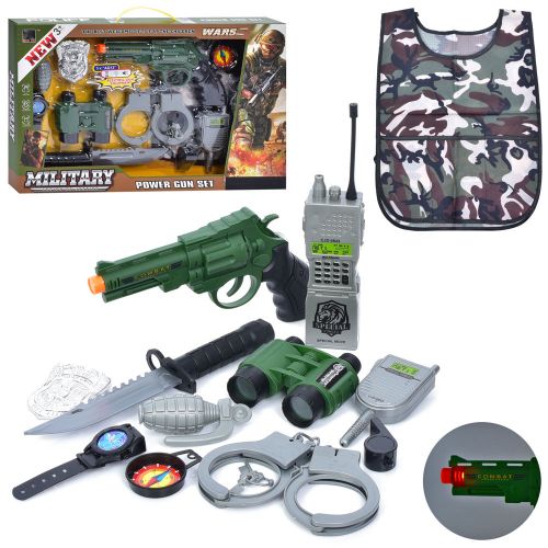 Великий військовий набір стане чудовим доповненням дитячих сюжетно-рольових ігор. У комплекті є пістолет зі світловими та звуковими ефектами, бінокль, наручники, дві рації (велика та маленька), ніж, наручний годинник, граната, компас, жетон та свисток. Набір виконаний з якісного та міцного пластику. Для дітей віком від 3-х років.