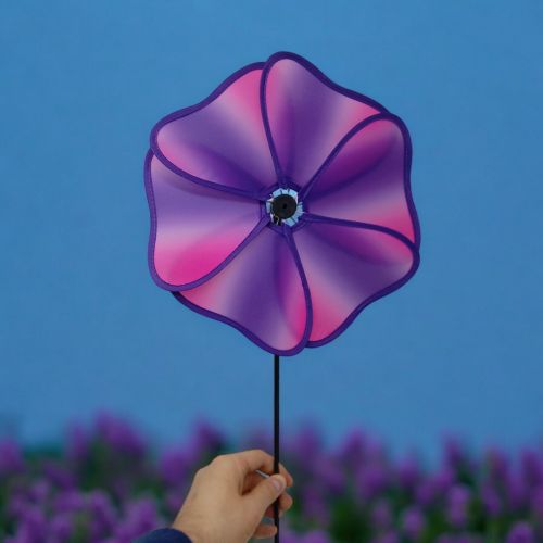 Яскрава іграшка-вітрячок. Іграшка складається з основи у вигляді текстильного квіточки-вертушки та палички, на яку він кріпиться. При подиху вітру – вертушка швидко крутитиметься навколо серединки. Висота з кріпленням – 50 см. Виконано з якісних та міцних матеріалів.
