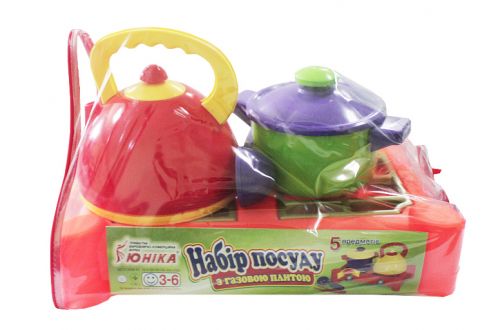 Газова плита (5 предметів: плита, чайник, каструля, ложка, виделка.). Матеріал: пластик.