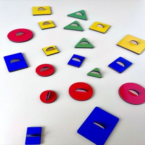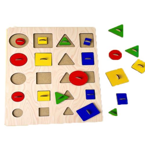 Набір складається з деревʼяної рамки з вирізами та, що відповідають їм, геометричними фігурами. Фігурки в наборі представлені в різних розмірах – це допоможе дитині не лише вивчити назву кольорів та форм, але й розібратися з поняттям розміру. Розвиває дрібну моторику, увагу, логічне мислення та памʼять. Розмір рамки – 22 х 30 см.
