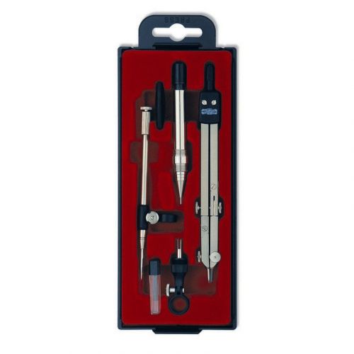 Готовальня містить 6 предметів: – металевий циркуль для кіл від 1 до 450 мм; – циркуль з падаючою голкою з затискачем для олівців; – адаптер для циркуля; – механічний олівець; – пенал з запасним грифелем; – викрутка з ручкою. Упаковка – пластиковий пенал з прозорою кришкою.