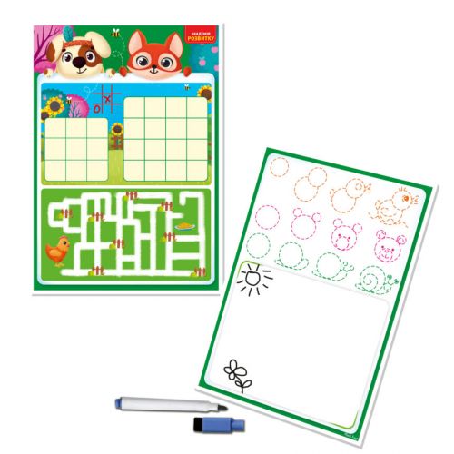 Гра-тренажер допоможе малюкові в ігровій формі навчиться писати та малювати по лініях. Дошка виконана з картону, має дві ігрові сторони. У комплекті є спеціальний маркер, що легко витирається з поверхні дошки.