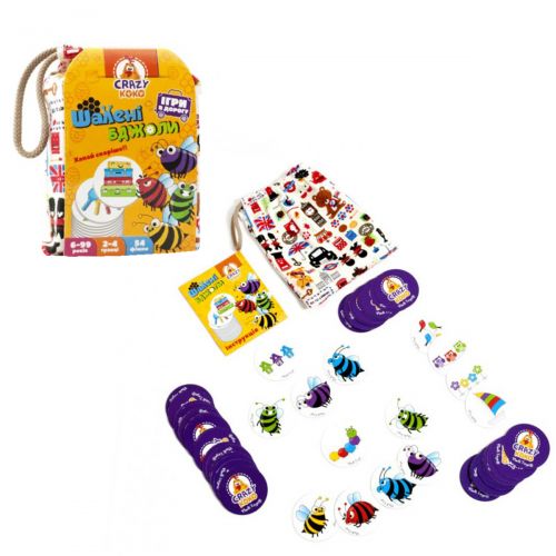 Захоплююча гра “Божевільні бджоли” призначена для 2-4 гравців, віком від 6-ти років. Мета гри – керуючись інструкцією, зібрати якомога більше фішок з різнокольоровими малюнками. У комплекті: тканинний мішечок, 54 фішки і інструкція. Розмір фішки: 6 см. Колір і дизайн мішечка попадається рандомно.