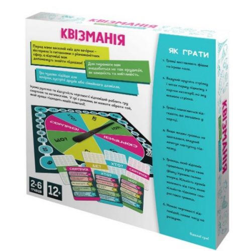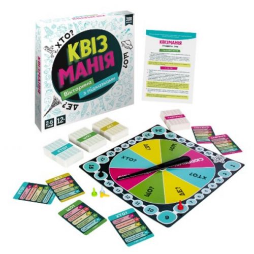 Перед вами веселий квіз для вечірки – вікторина іх питаннями з різноманітних сфер, а відповіді вам допоможуть знайти підказки! Ігрова рулетка та відсутність черговості відповідей роблять гру азартною та мегавеселою. У грі 2 режима, ви можете обрати той, який краще підходить вашій компанії. Українською мовою. Для 2-6 гравців. Вік: 12+.
