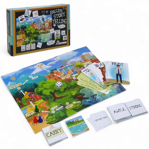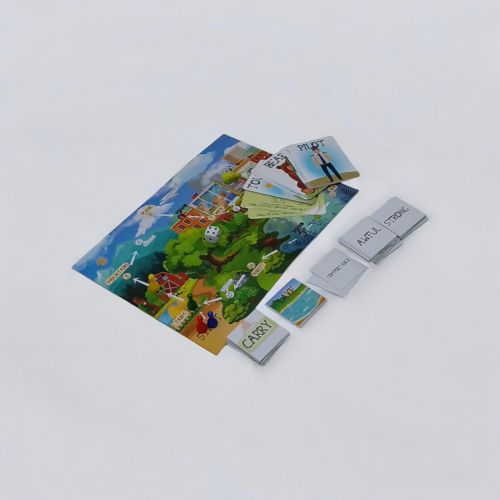 Комплектація: 12 карток з персонажами, 32 картки з прикменниками, 32 картки з іменниками, 42 картки з дієсловами, ігрове поле (22 х 31 см), 4 фішки, кубик
